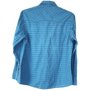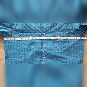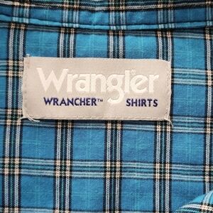 Please note that the size tag is missing. I have provided photos with measurements and a Wrangler Size chart. Make sure you look at these before purchasing. Vintage Wrangler Rancher blue plaid shirt with snap pearl buttons, western cowboy style with buttoned front flap pockets, long sleeves with 3 button cuffs. All buttons are snap pearl. It is in excellent condition. No stains, no rips, no snags, no piling, and no missing snap buttons. SKU0711