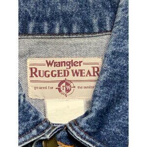 This vintage Wrangler Rugged Wear denim jacket a timeless jean jacket style with a button-up front. Crafted for durability and comfort, it's designed for outdoor adventures. The classic blue color pairs well with various outfits, making it versatile for different settings.