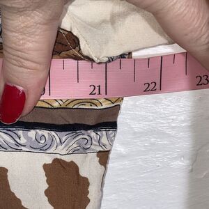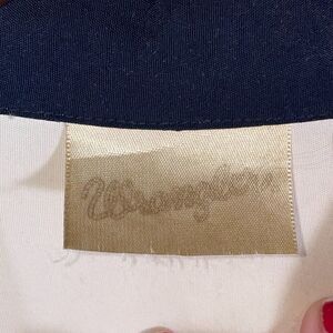 Description: Vintage Wrangler Western shirt featuring bold scarf-print bands with chain and medallion details across the chest. Classic cream and navy color block, button front, pointed collar. Gold satin Wrangler tag indicates late 80s, early 90s. Light pilling under arms and faint marks. Unique vintage western statement piece perfect for rodeo, concert, or retro streetwear styling.
