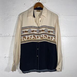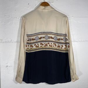 Keywords and Style Keywords: vintage western shirt, 80s cowboy blouse, 90s rodeo style, scarf print top, equestrian pattern, country concert outfit, retro Wrangler shirt, silky button down, chain print shirt, cream navy blouse, cowboy chic, Americana fashion, Poppy House 502