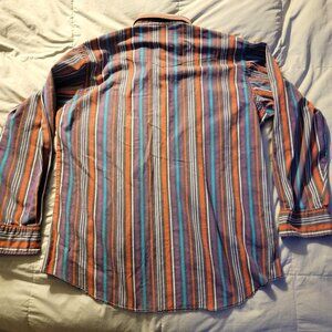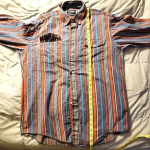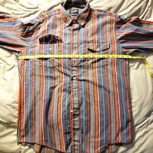 Wrangler cowboy cut striped shirt. Regular fit x-long tails on tag. Size: 16 1/2 - 34