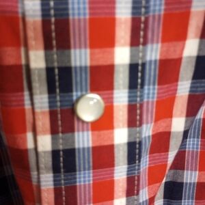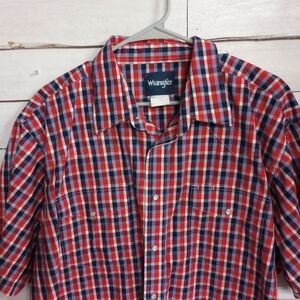 Vintage Wrangler Shirt Men's Pearl Snap XXL Red White Blue Short Sleeve Western Cotton. The size tag is missing but it measures as a 2XL. Approximate measurements are laying flat armpit to armpit 28" and length from shoulder to hem 32". Condition is pre owned, used, good condition.