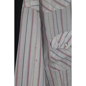 This vintage Wrangler shirt in size L features a collared neckline, snap pearl buttons, and multicolor stripes on twill fabric. It has a regular fit and is a button-up style with long sleeves. The shirt is a great addition to any wardrobe and is perfect for all seasons. It has pockets and is wrinkle-resistant, making it easy to care for and machine washable. The shirt is part of the Cowboy Cut X-Long Tails product line and has a Western, Cowboy, 90s, and Retro theme.