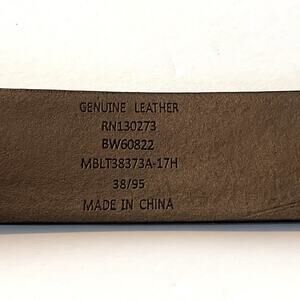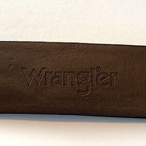 This listing is for a Vintage Wrangler men's Tooled Leather Belt, in good condition. It has a geometric pattern in a muted black and brown combo. All markings shown in photos, as well as the length measured against two yard sticks.