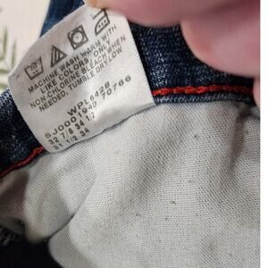 These blue jeans straight leg, mid rise, and denim fabric with 5 pockets and logo accent.