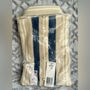 • Design: Beige and cream stripes with contrasting blue stripes, pearlized snap buttons