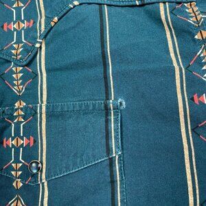 Classic Western-style shirt with teal Aztec-inspired print, dual chest pockets, and convenient snap button closures. Ideal for casual or rustic-themed attire.