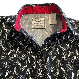 Vintage Wrangler Western Wear for Women Button Shirt Roping sz. Large. This is an awesome vintage western roping shirt and the pattern is so unique it is surely a conversation piece. It is in great pre-owned condition and the only flaw I noted was the very top button is missing, all other silver-colored buttons are present. Smoke free home.