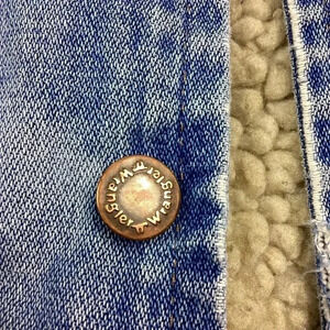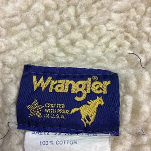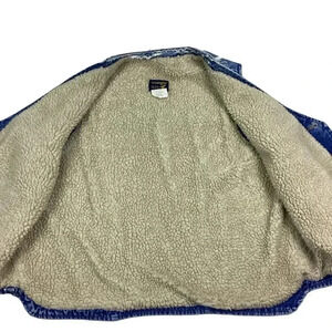 Vintage Wrangler denim Sherpa vest. Made in the USA. 70s/80s. Two front slide pockets. Button front enclosure. Tagged as an XXL. Measures more as an XL. 23 inches pit to pit, 26 inches long. Overall, really good vintage condition, faded, has some light discoloration and distress throughout as shown in photos. Smoke and pet free home. 🇺🇸