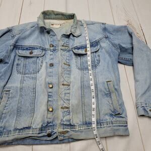 Cool vintage Wrangler " Rugged Wear" jean jacket! Lighter wash and very thrashed with lots of staining and a larger hole on the back of the neck. No size so please see measurements. Fits about a mens oversized large/XL