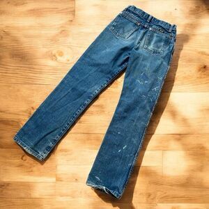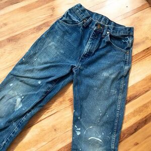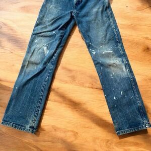 Vintage Wrangler straight slim leg medium wash jeans with a high waisted rise. 5 pocket. Classic style. Overall distressing, paint stains.