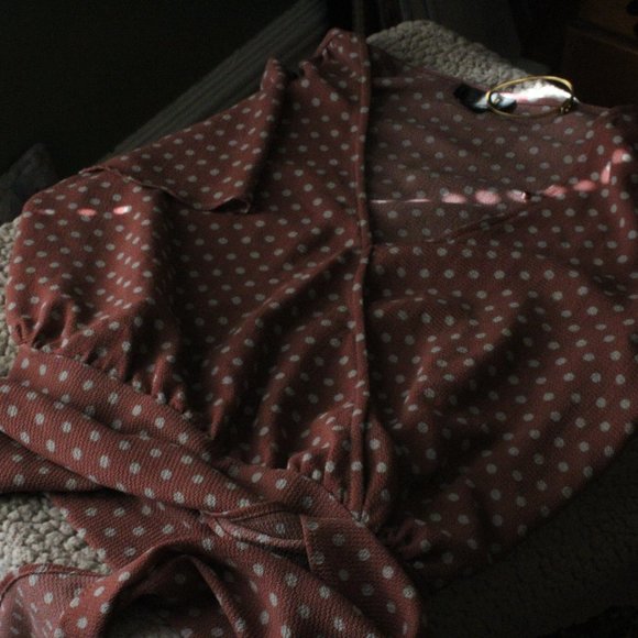Super Cute and flattering elegant Rusty Rose wrap up blouse with strap on bottom and elastic waist. Fits a size small with comfy room and medium snug.