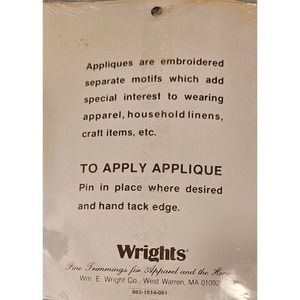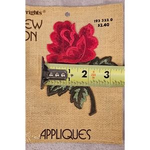 Never opened packages of 6 sew on rose appliques by Wrights. See photos for rose dimensions.