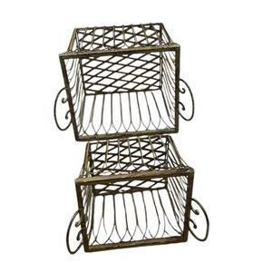 Vintage Wrought Iron Square Ornate Handles Basket Sage Green, Set Of 2