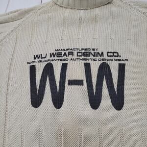Rare vintage Wu Wear turtleneck sweater! Cream with a large logo front and Wu patch on the sleeve. In sturdy condition for its age, no holes but does have some faint stains. Most are right under the logo and then there are some around the inside of the neck. Size XL. Sweater is a bit oversized and has lots of stretch.