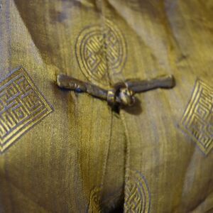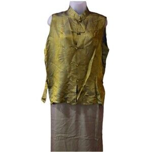 This elegant Vintage XL two-piece set is crafted from muted green 100% silk. The sleeveless top features a high collar and traditional frog closures, offering a sophisticated cheongsam-inspired silhouette. The coordinating wrap skirt has an unconventional layered design, adding unique charm to the ensemble. Perfect for special occasions, cultural events, or as a statement Qipao-inspired look. The luxurious silk brings timeless vintage sophistication to any wardrobe.