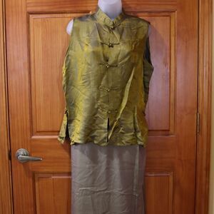 Vintage XL 100% Silk Top & Wrap Skirt Set - Muted Green Cheongsam Style