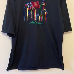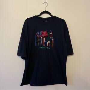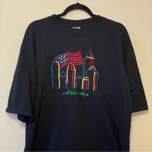 Details: Vintage short sleeve t-shirt Atlanta, Georgia embroidered cityscape American flag Stars and Stripes streetwear urban vacation travel tourist