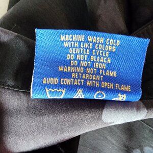 Lightweight relaxed fit collared button down shirt - black with a gray card suits pattern. Fire flames, dice & playing cards design on the bottom edge. Las Vegas embroidered stitched on the front. 100% Polyester.
