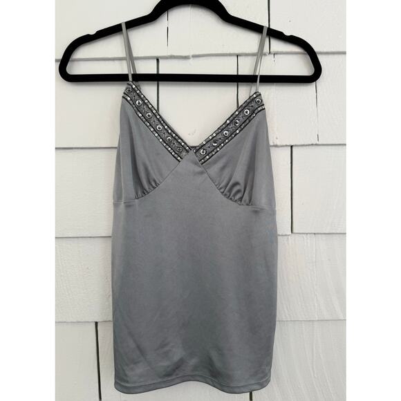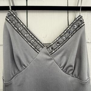 Vintage Xhilaration Women's Size Small Y2K Silver Satin Beaded Sequin Shimmery Metallic Semi-Sheer Babydoll Cami Tank Top Coquette w/ Adjustable Straps