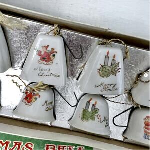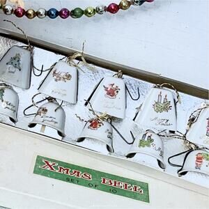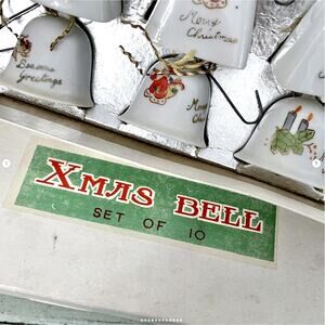 Vintage “Xmas Bell” set of 10 porcelain Christmas-themed bell ornaments, in original box marked Japan.