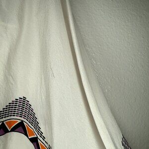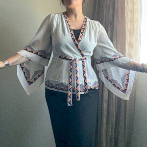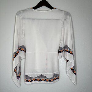 Details- This is a vintage Y2K 200s era white silk kimono style wrap blouse by BCBG. Has a fun print on the edges and unique sleeves. (The label is missing but this is from my own collection and I personally purchased it from a BCBG store back in the day.)
