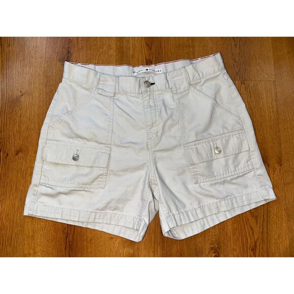 Super cute pair of Y2K women's Tommy Hilfiger shorts. The color is a very light (almost white) khaki. The tag says these were produced in 2003. Size is women's 10. Inseam is 4.5"- perfect length, not too short or too long. Rise is 10". These shorts have a cargo style with the two lower button flap pockets on the front, two side pockets above those, and one button back pocket. All buttons have Tommy logo and back belt loop has shows the tag colors. These shorts are in excellent condition, no holes or stains noted. Coming from smoke free pet free home.