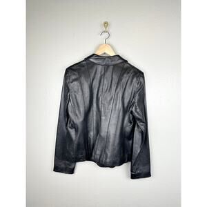 Super soft iconic Y2K black leather blazer. Button up with two front middle black plastic buttons. Two inner smaller buttons. Notched collar. Long sleeves. Two front jetted pockets. Paneled construction. Inside is lined. Brand is Jones New York.