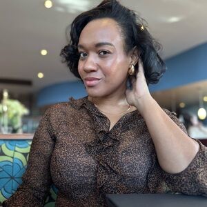 Stylish brown leopard print blouse with ruffle details. Perfect for a chic look.