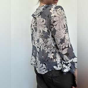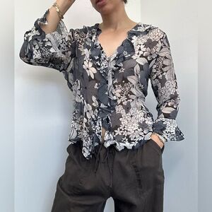 Vintage Y2K 100% Silk Ruffle Boho Floral Shirt Semi Sheer Blouse Size L