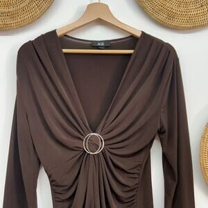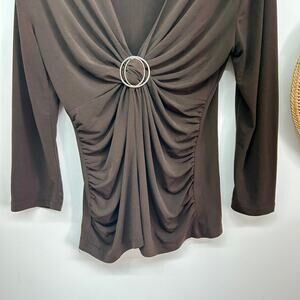 Vintage Y2K 2000s AGB Neutral Brown 3/4 Sleeve Cinched Ruched Stretch Top Small