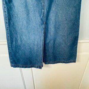 Vintage medium wash denim maxi in a PETITE size. Button and zip closure with wide belt loops, front slit and back gore added. 4 front pockets (2 regular and 2 smaller) and 2 rear cargo button down flap pockets. Size 6 Petite. 100% Rigid Cotton Denim.