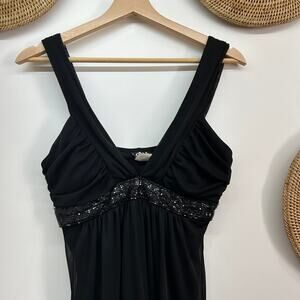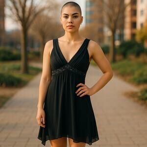 Add a touch of Y2K nostalgia to your wardrobe with this vintage DEB mini dress! This black V-neck dress features an asymmetrical hem and is has a beaded/sequins type trim on bodice, making it perfect for a night out or a special occasion.