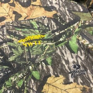 Vintage Y2K 2000s Jerzees Outdoors Mossy Oak Obsession Camouflage Black Brown Men's Size Hunting Camo Shirt long sleeve crewneck chest pocket embroidered spell