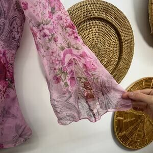 Vintage Y2K 2000s Worthington Pink Ruffle Flower Floral Long Sleeve Silk Blouse Top Medium Feminine Fairy Boho Flare Sleeves with Slit