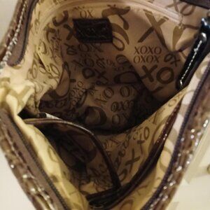 Vintage Y2K 2000s XOXO leopard print purse with brown and black patent leather accents, adjustable straps, multiple inner pockets, and zipper closure.