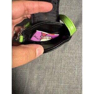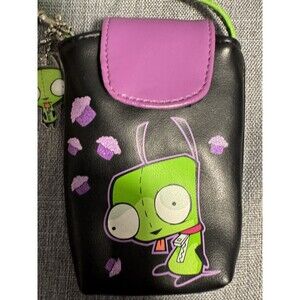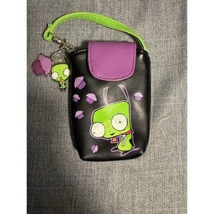 The product is a vintage Y2K 2007 Nickelodeon x Invader Zim cell phone holder pouch, featuring charms related to the popular animated series. This rare collectible item combines the nostalgia of Invader Zim with the convenience of a cell phone holder, making it a unique piece of animation merchandise for fans of the show.