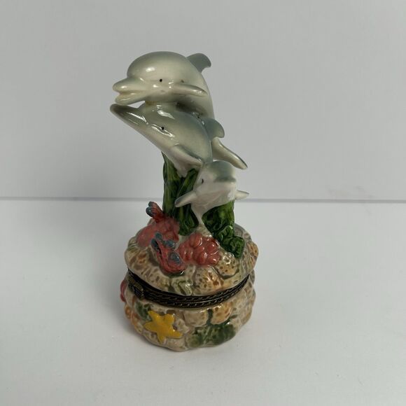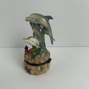 Vintage Y2K 3 Dolphins Trinket Box On Coral 4.25”x2”