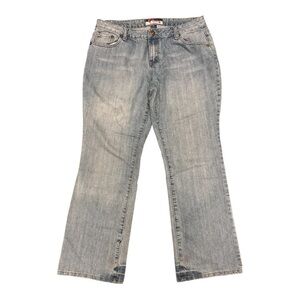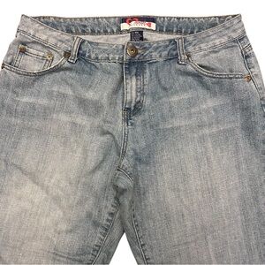 Super comfy & cute, mid rise, boot cut stretch jeans, some distressing at bottom hem, and embroidery on both back pockets.
