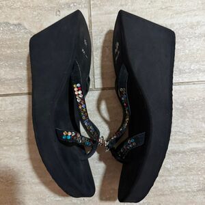 Vintage Y2K Black chunky Platform Sandal Flip flops with rainbow rhinestones Size 8