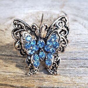 Vintage Y2K 90s Blue Crystal Butterfly Silver Adjustable Cocktail Ring