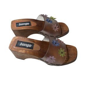 Vintage Y2K 90s Bongo Leather Buckle Wood Wedge Platform Open Toe Clogs Size 6 Womens. In good condition. Block chunky heels. Slip on.