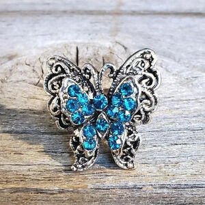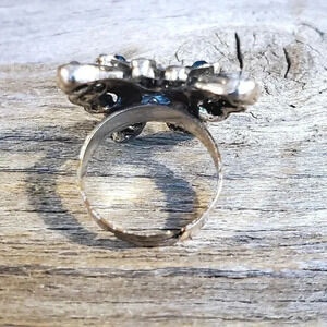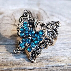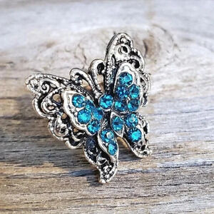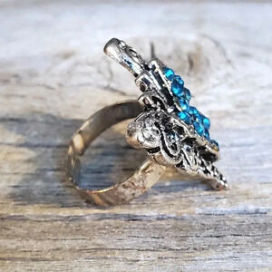 Vintage Y2K 90s Deep Teal Crystal Butterfly Silver Adjustable Cocktail Ring