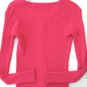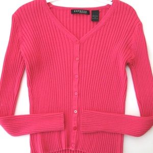 Vintage Y2K 90s Express womens long sleeve V-neck cardigan sweater button up top blouse in fuchsia/pink-red (neon berry color?) ribbed textured fabric with button closures at front - womens sweater, sweater for women. Stretchy fabric material. Excellent condition, pre-owned. Material is 100% COTTON. Womens sweaters great as casual wear during winter or fall season, etc. Hurry! We only have ONE PIECE of this item!