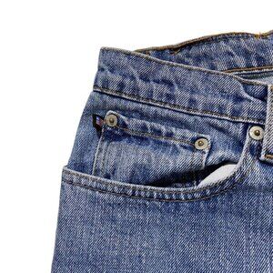 Vintage Polo Ralph Lauren Saturday Jean Men’s Light Wash Crosshatch Pattern Rigid (100% Cotton) Mid-Rise (10”) Straight Leg Blue Jeans Size 34 with an Inseam of 30”. These jeans are preowned, vintage, and in very good condition.