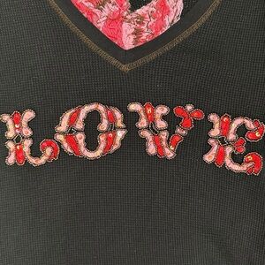 Vintage Y2K 90s Rock Solid Embroidered Embellished V Neck Thermal Tee Medium
