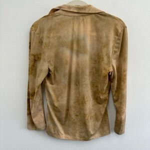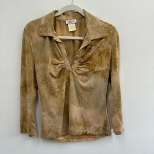 Vintage Y2K 90s Ruched Collared Polo Beige Tie Dye Long Sleeve Top Size M
