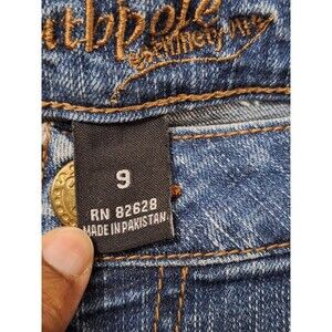 This product is a pair of Vintage Y2K 90s Southpole Wide Leg Low Rise Jeans in women's size 9. The jeans feature a faded hip hop logo, accented with embroidered details and a 5-pocket design. Made from a comfortable cotton blend fabric with a mid-rise waist, these jeans are perfect for a casual, laid-back look. The wide-leg style adds a trendy and retro touch, making them ideal for various seasons such as winter, summer, fall, and spring. The Southpole brand and vintage appeal make these jeans a unique and stylish addition to any wardrobe. Waist 28 in. Inseam 30 in. Rise 8.5 in. Length 40 in.