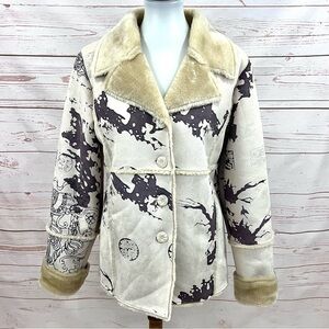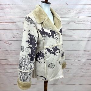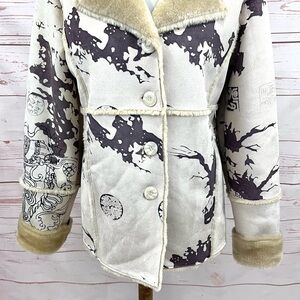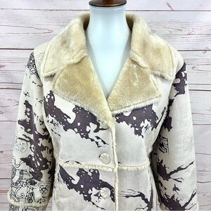 Vintage Y2K Step in Style Faux Suede Fur Lined Winter Pea Coat. So warm and cozy, fully lined withs faux fur, and a soft vegan leather suede outer with an Abstract Asian like dragon print. Button front. Faux fur is super soft. In excellent condition. No flaws!