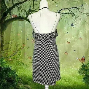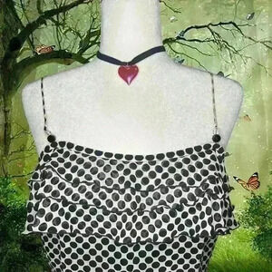 Vintage 90s Ruffled Polka Dot Midi Dress. Super light weight material and really comfortable, ruffled detailing on the bust area, non adjustable shoulder strap with cute beads, back zipper closure, 100% Silk, Made In Hong Kong. Would look perfect with a pair of kitten heels. Brand: Aj Bari